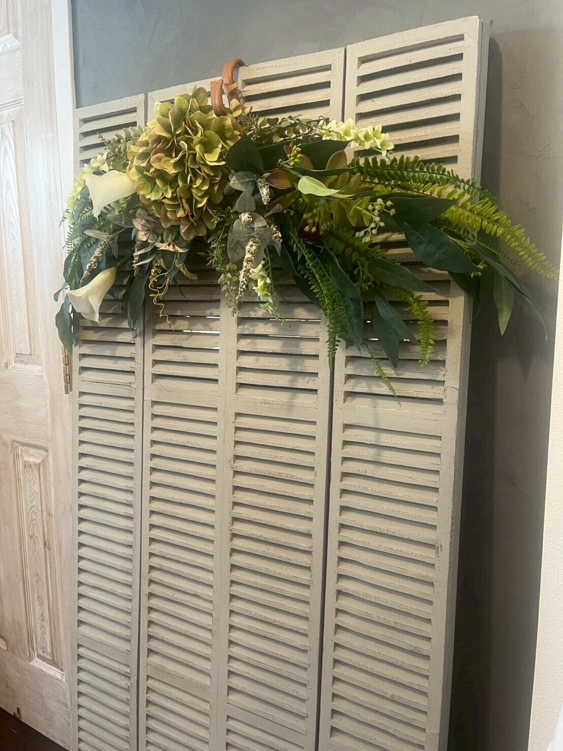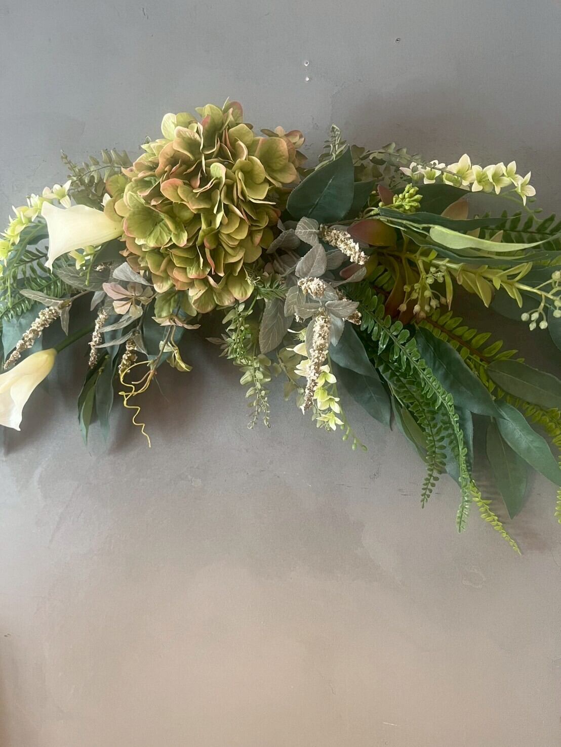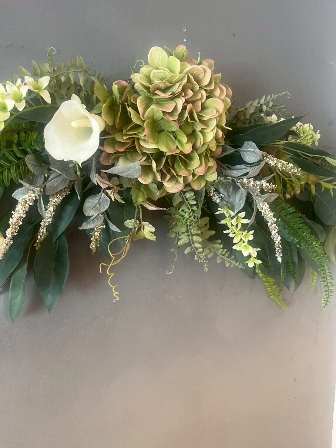 上質なアーティフィシャルフラワーを使用した横幅約90センチのスワッグ。大輪のあじさいを中心に、カラーやグリーンをたっぷりあしらった豪華なデザインです。ドアの上に飾ったり、玄関飾り、壁飾り、店舗ディスプレイ、結婚式の飾花としても存在感抜群。フェイクグリーンを使用しているので水やりの手間もなく、枯れないインテリアとして長く楽しめるのも魅力。新規オープンのサロン様へのお祝いの場合ラッピングも可能ですので、商品欄から「フラワーラッピング」をお買い求めください。